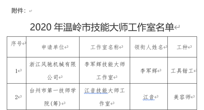 我司根據《關于深入實施2020年度溫嶺市技能大師工作室項目建設及考核評估的通知》(溫人社發〔2020〕59號)文件精神,通過自行推薦以及地方政府的大力支持,充分準備了相關申報資料,通過主管部門的初審以及專家的評審、部門審議和社會公示等評選環節,我司最終順利通過評審,被評定為“李軍輝技能大師工作室”并于政府平臺公示。